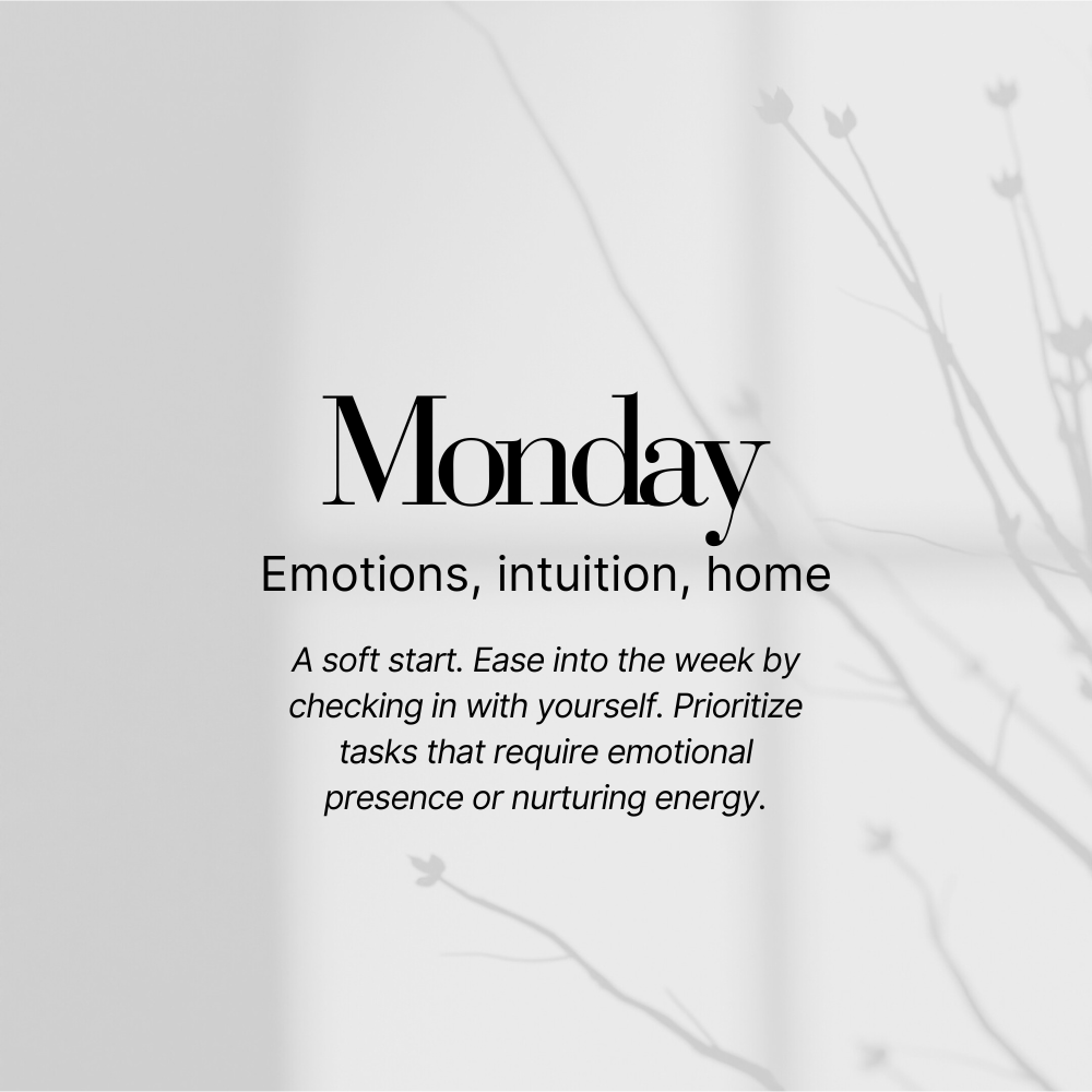 Monday is ruled by the Moon — tied to emotions, intuition, and cycles. You don’t have to spend the day journaling by candlelight (though you can if you want). It simply means there’s value in starting slow, checking in with yourself, and easing into motion with intention.