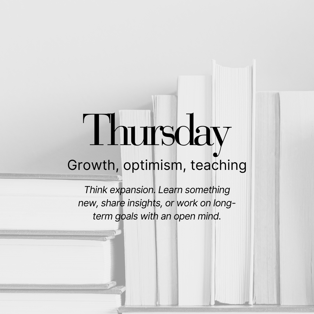 Jupiter, the planet of expansion, opportunity, and generosity, rules Thursday. Don’t shrink your ideas before exploring them.