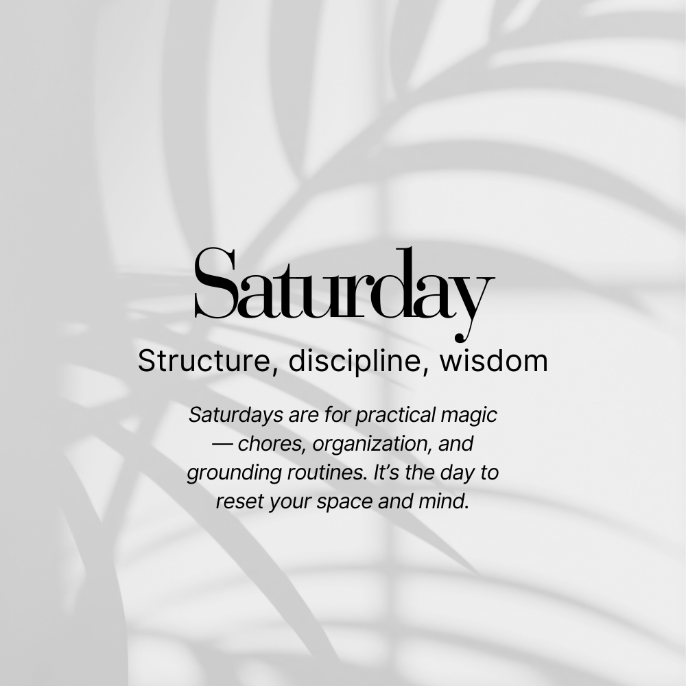 Saturn, the taskmaster planet of discipline, responsibility, and boundaries, rules Saturday. Use this day to strengthen systems, habits, or long-term goals.